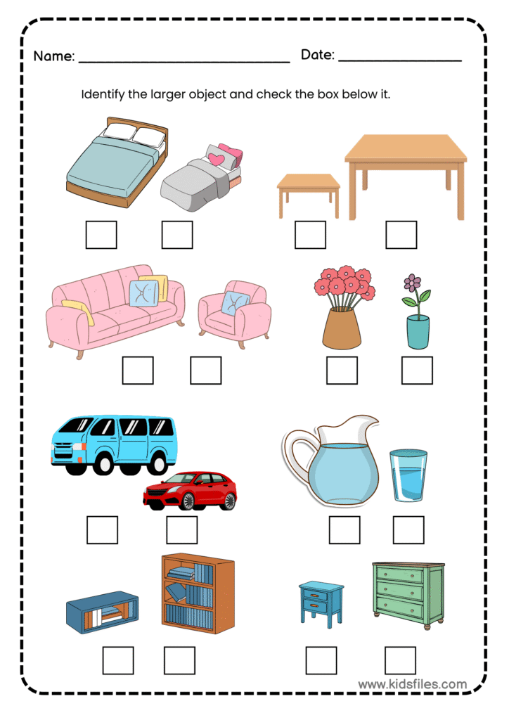 Size comparison supports early classification and logic skills. This is useful for preschool and kindergarten building observation skills.